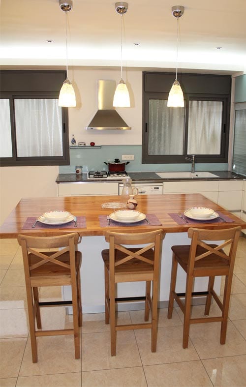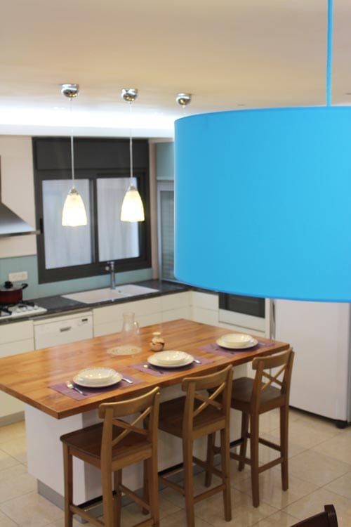 בפינת האוכל נתתי מענה לתכלת של המטבח על ידי אהיל עגול בצבע טורקיז. אני מאוהבת באהילים האלה!