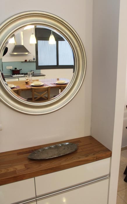 במבואת הכניסה שנמצאת מול המטבח החלפנו את משטח השיש האפור לפס מאותו עץ של הבוצ'ר והוספנו מראה על מנת לפתוח את הנישה.