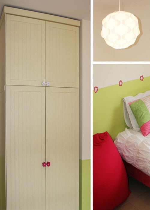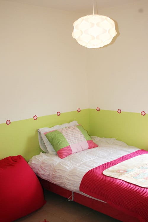 להשלמת האווירה הקלילה והחופשית הוספתי שני פרפרים בסגול ואדום, כריות סוכריה בגווני ורוד ואהיל חרוזים בגווני החדר.