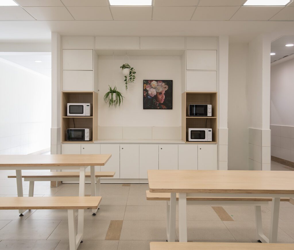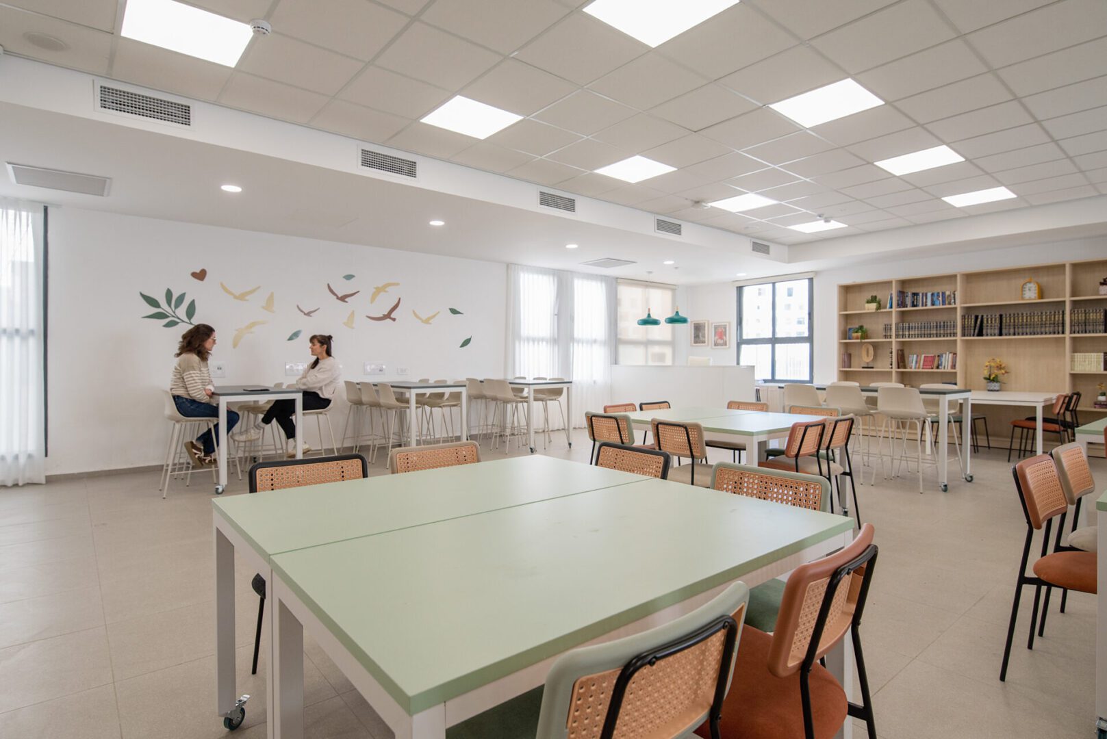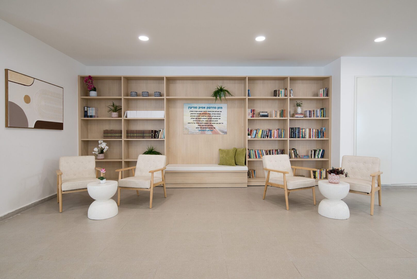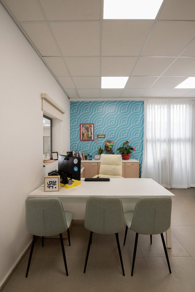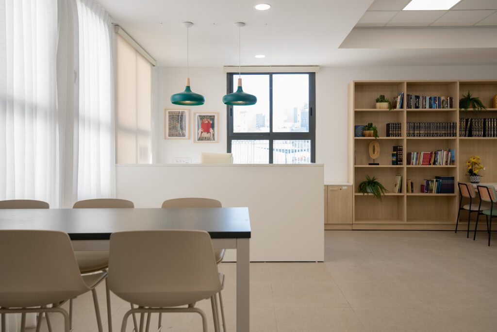 חדר המורים ומשרדי ההנהלה עוצבו כסביבת עבודה פונקציונלית ונעימה לשהייה שבין השיעורים, והספרייה קיבלה אופי שקט ומיוחד. התכנון כולו שם דגש על יצירת תחושת שייכות, חמימות וזרימה טבעית, תוך התאמה מדויקת לצרכי המקום והמשתמשות.